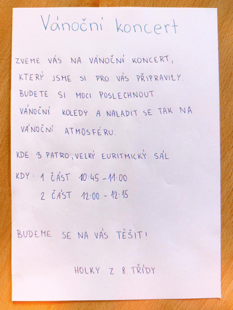Čeká vás také koncert, vánoční hra, školní kavárna a mnoho dalších laskavých překvapení, která se nejlépe objevují tam, kde je hodně světýlek, skořice a dobré nálady.